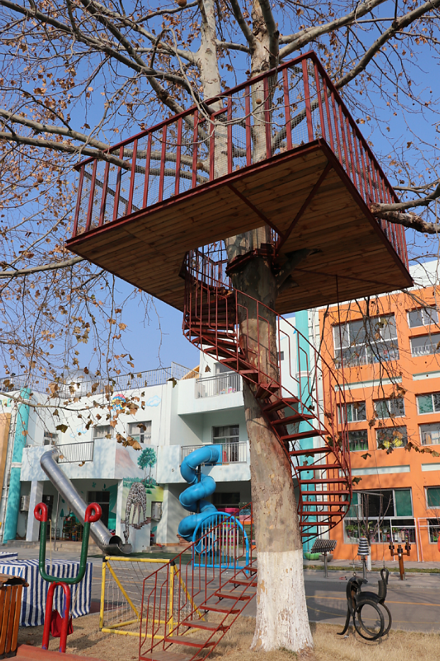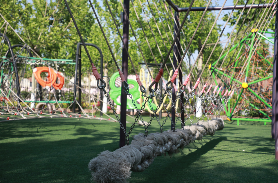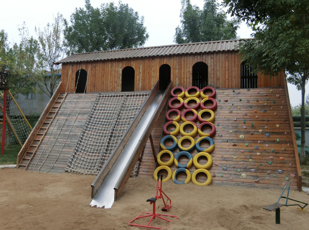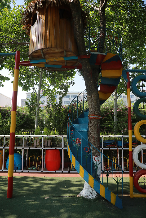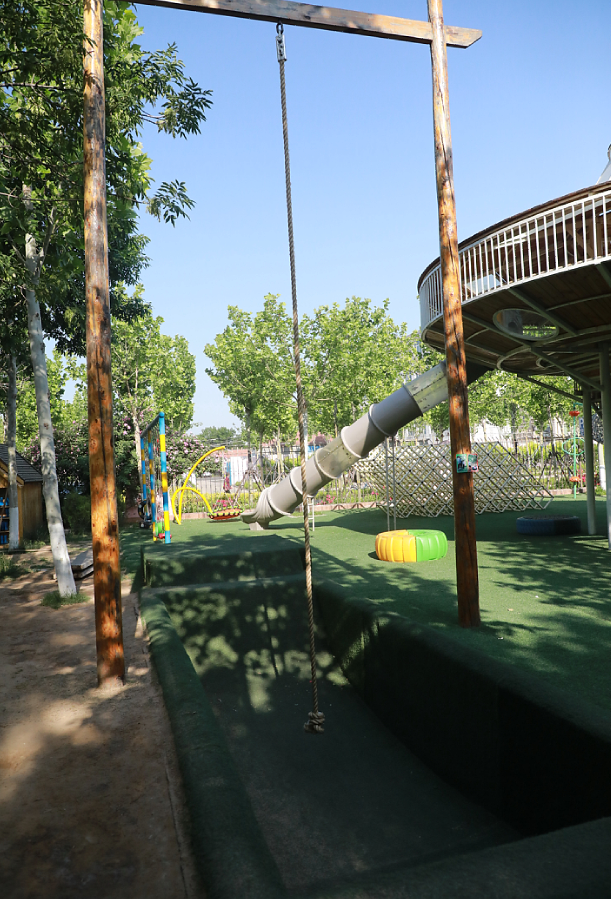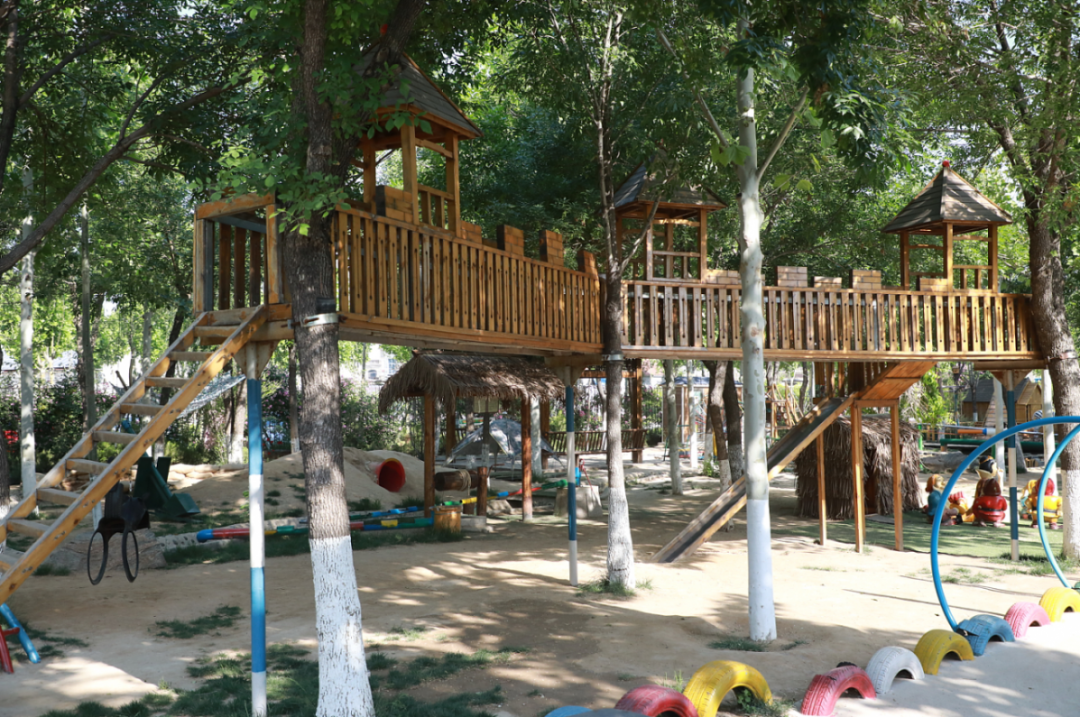 利津二幼有广阔的游戏空间,超大的攀爬架、树屋、大滑梯、森林栈道。