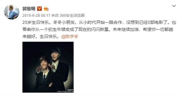 毕竟名不见经传的陈学冬一出道就在【小时代】里担任戏份很重的角色,可以说他是靠郭敬明一手捧红的。