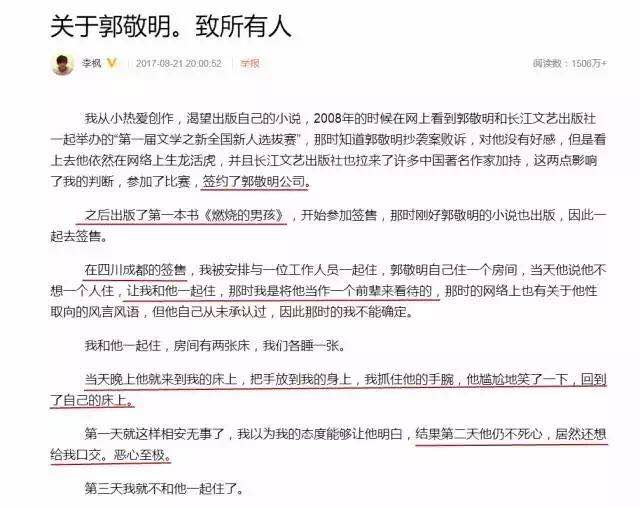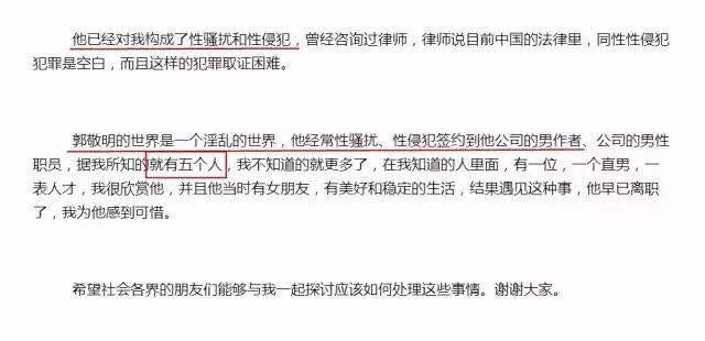 文中不仅提到郭敬明对他进行性骚扰,还表示仅他知道的被骚扰的就有五个人,最后还呼吁:一切男性都不要靠近郭敬明。