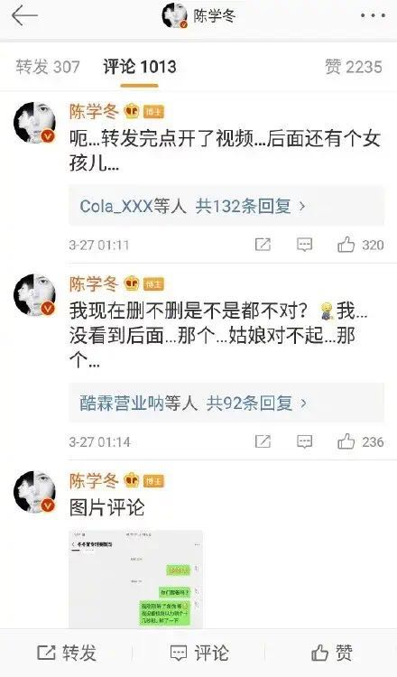 随后,陈学冬迅速在评论区解释称:“我没看到后面,那个…姑娘对不起…”