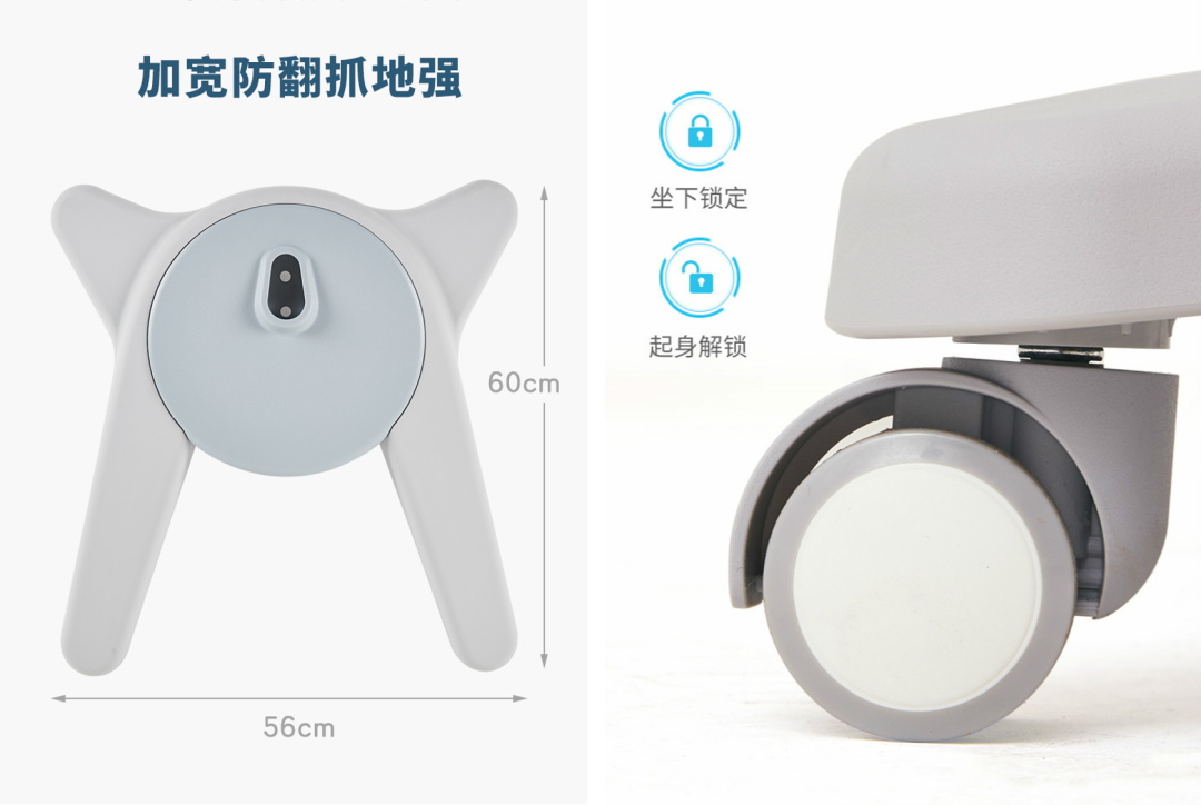椅子的安全性也特别让妈妈放心,60cm 超长尺寸椅脚,一体成型,重心更稳,抓地更牢。