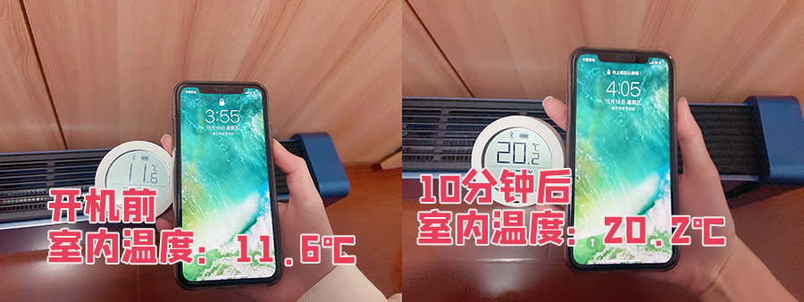 我们直接拿温度计做测试,在 14㎡的房间里,开机 10 分钟,室内的温度就直接上涨了将近 10℃👇
