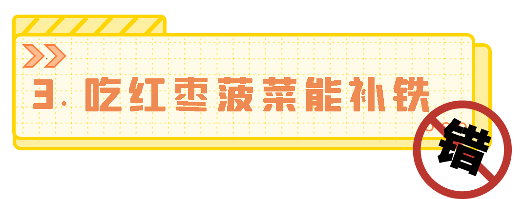 红枣、菠菜不补铁!每 100g 红枣中铁元素的含量还不到 3mg ,而且这些食物所含的铁,属于非血红素铁,吸收率比红肉低多了!